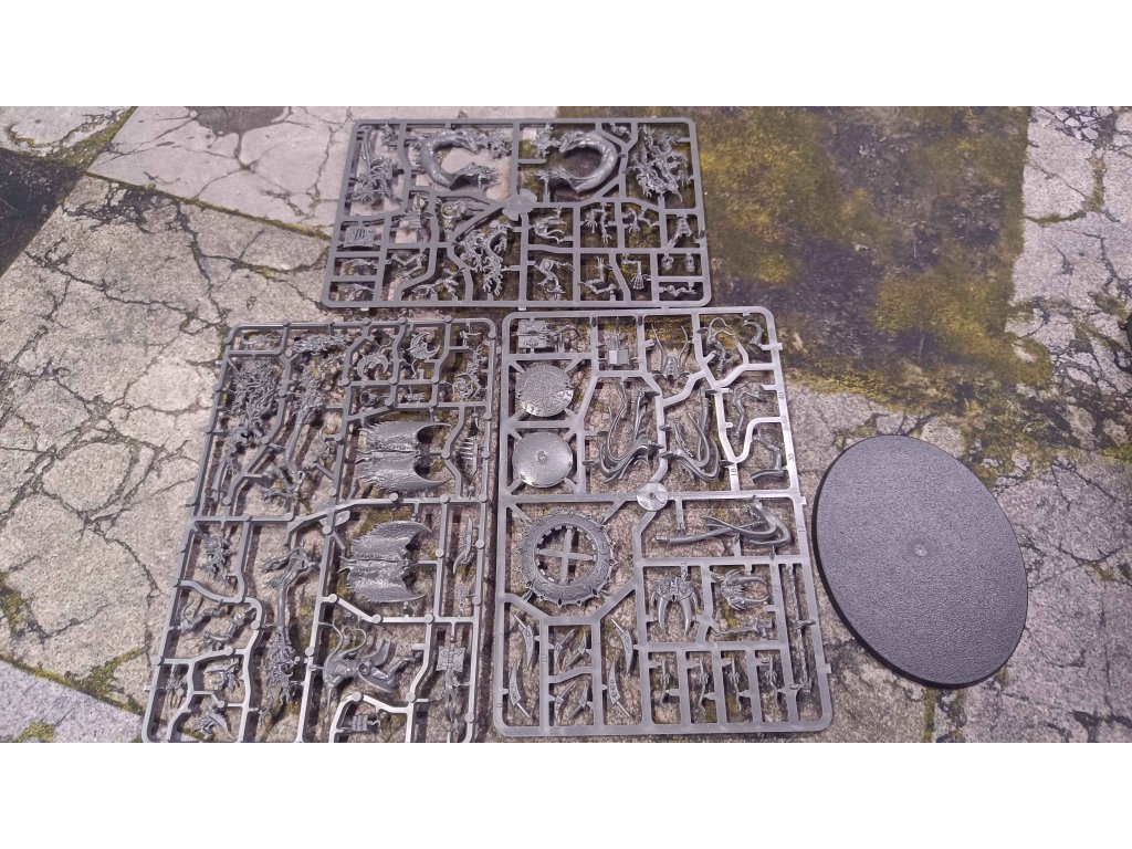 Disciples of Tzeentch Burning Chariot ve sprue, návod není součástí, dostupný online.
