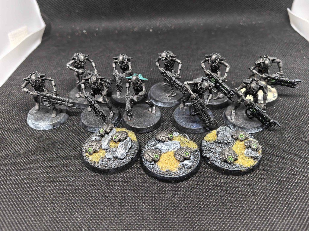 1x Necrons Warriors, modely jsou sestavené, s černým primerem a částečně nabarvené.