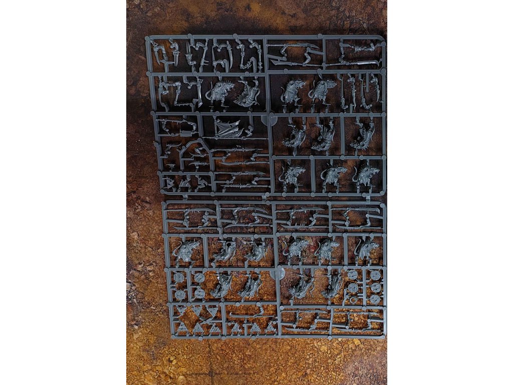 20 Modelů Skaven Clanrats, ve sprue, podstavce a návod součástí.