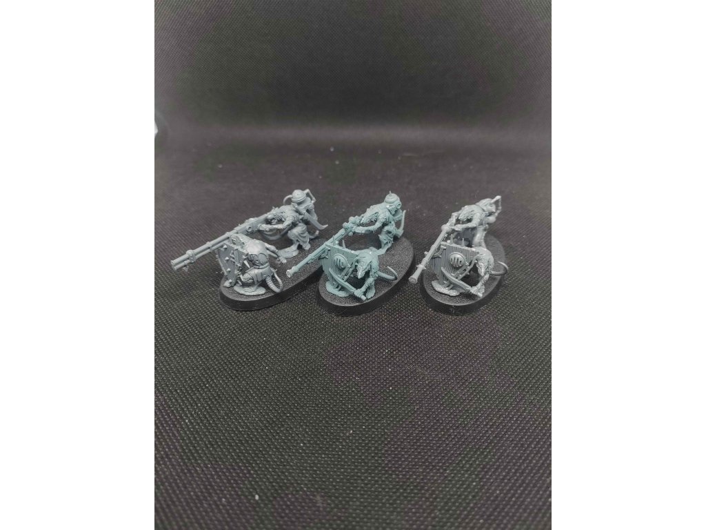Skaven Warplock Jezzails, slepený a 1 model stříknutý šedým základem.