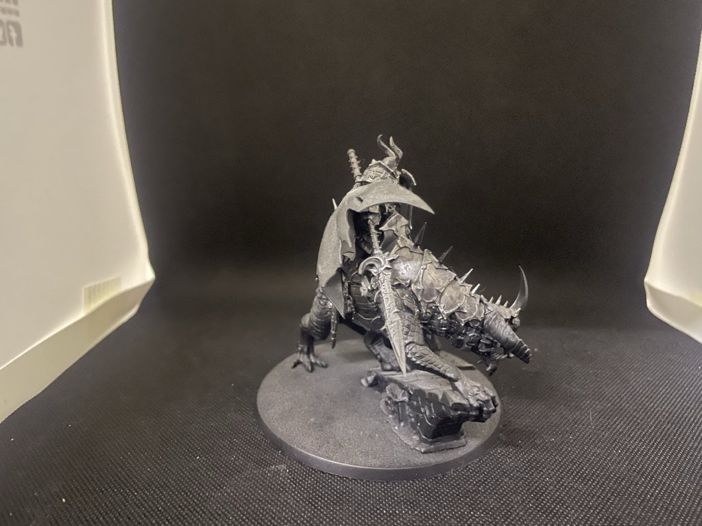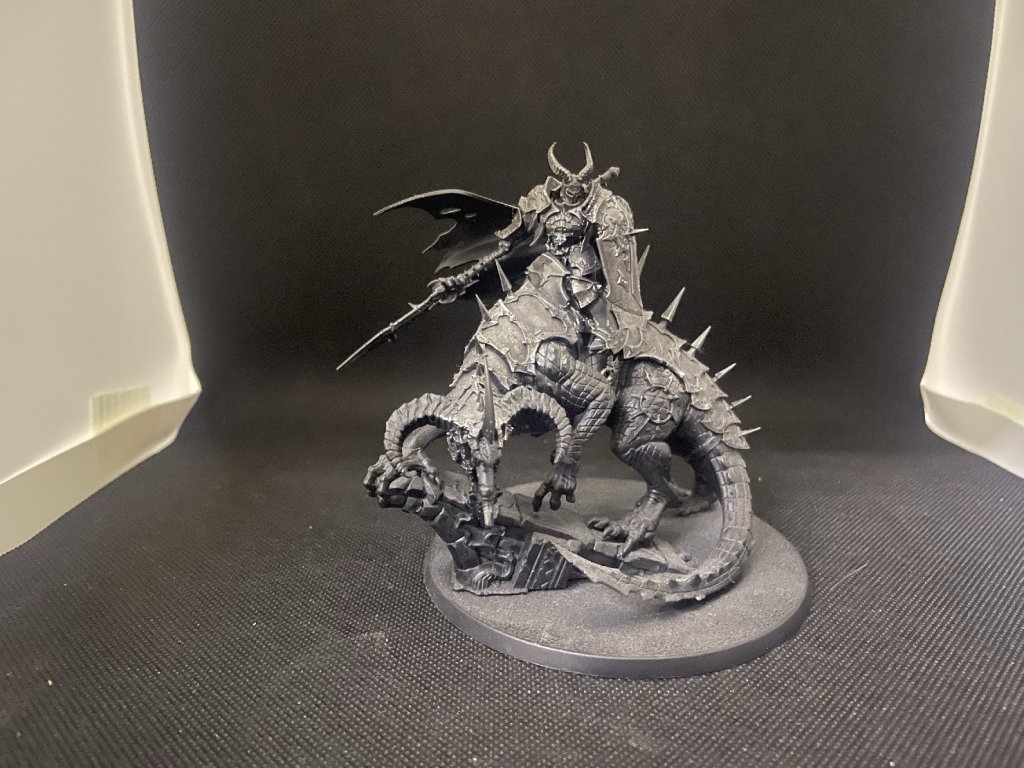 1x Slaves to Darkness Abraxia Spear of the Everchosen černý primer + drybrush stříbrnou, magnetovaný podstavec