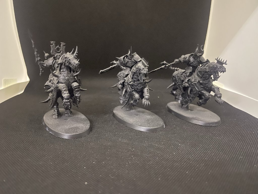 3x Slaves to Darkness Varanguard Knights Of Ruin, černý základ, stříbrný drybrush, magnetovaný podstavec