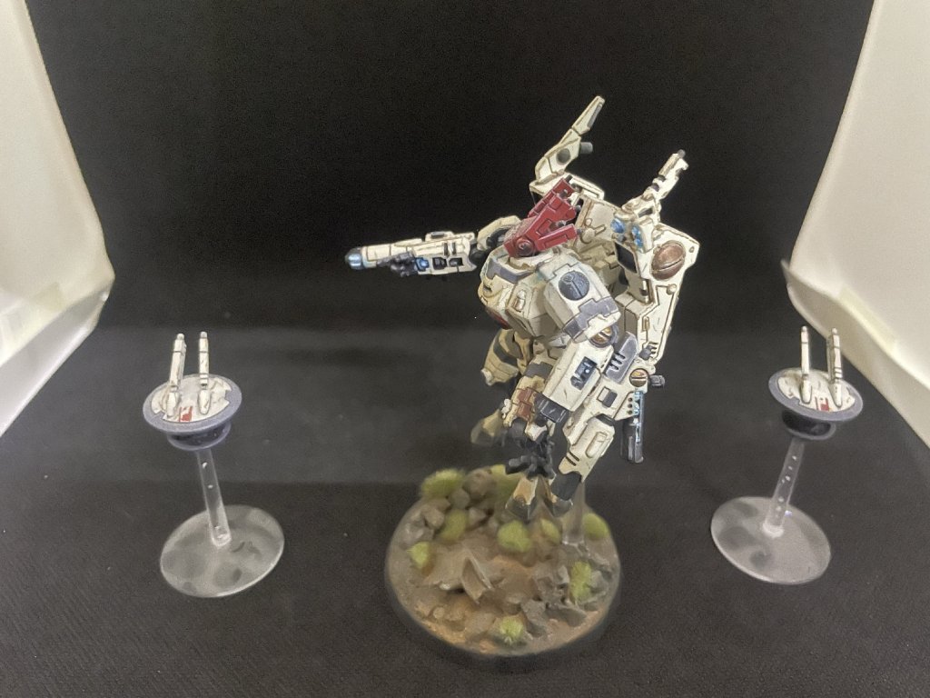 1x Krásně nabarvený Tau Empire Commander in Enforcer Suit vybavený Plasma Rifle a Airbursting Fragmentation Projector