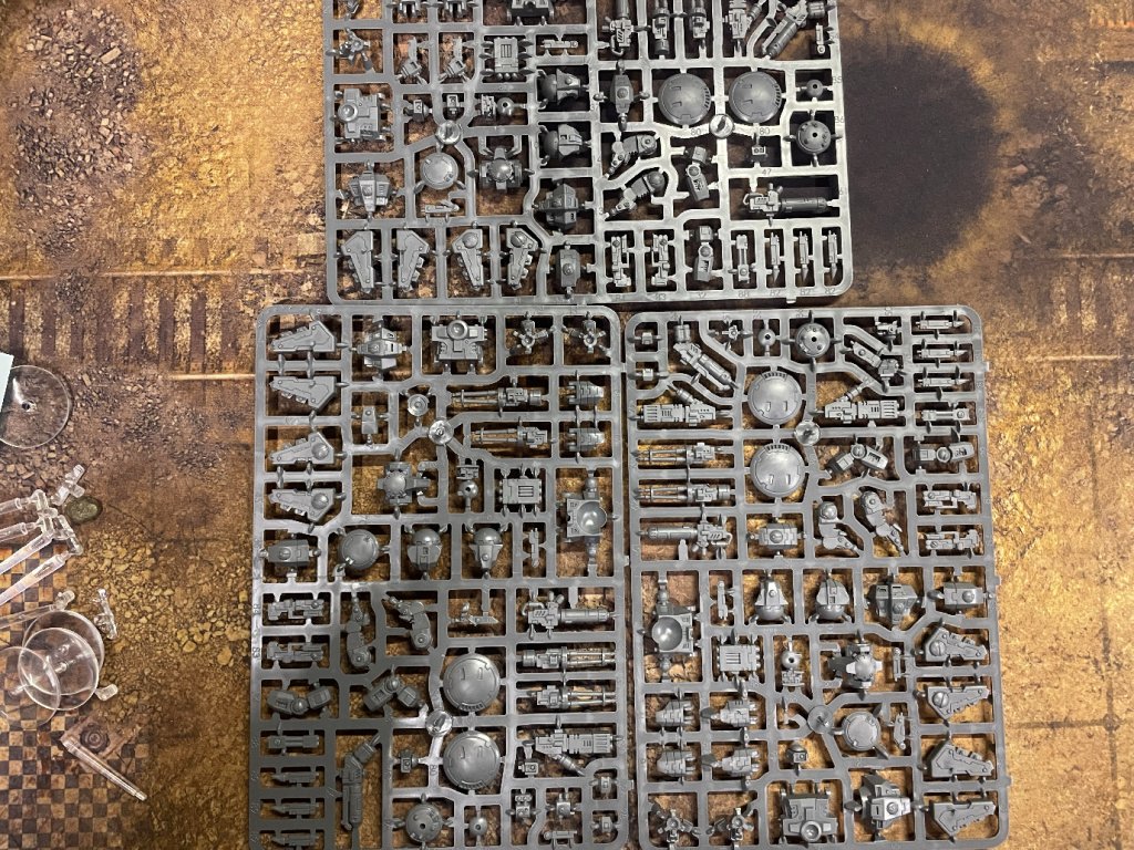 3x Tau Empire XV8 Crisis Battlesuits ve sprue, obsahují podstavce a návod.