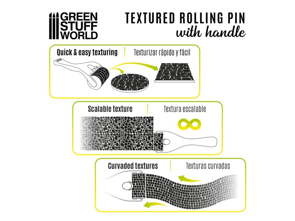 Strukturovací válečky jsou určeny k vlisování struktury do plochy tmelu (green stuff) ze kterého lze poté vykrajovat sekce jako strukturu na podstavce a k podobnému použití.