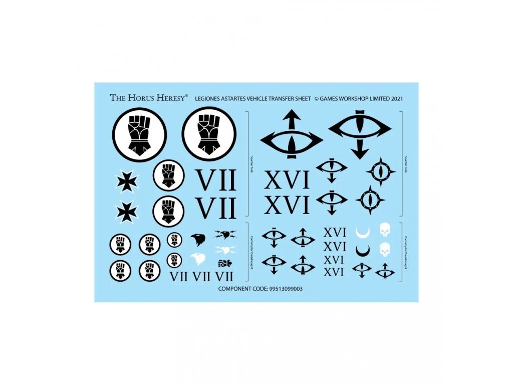 - 1x Legiones Astartes Vehicle Transfer Sheet s 44 znaky a ikonami Sons of Horus a Imperial Fists Legions